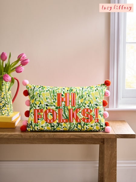 Lucy Tiffney Hi Folks Slogan Kissen mit Pomponbesatz