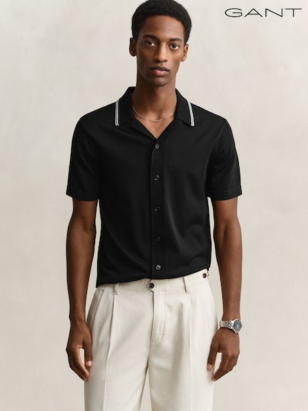 Schwarz - GANT Strickhemd mit durchgehender Knopfleiste und Paspelkragen