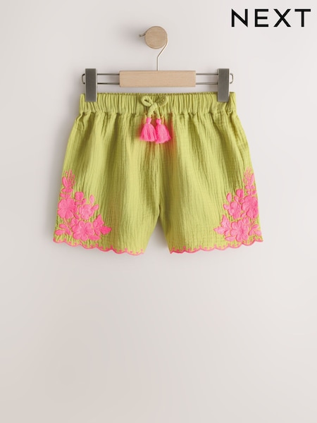 Green/Pink Embroidered Doublecloth - Scallop Hem Shorts (3-16yrs)