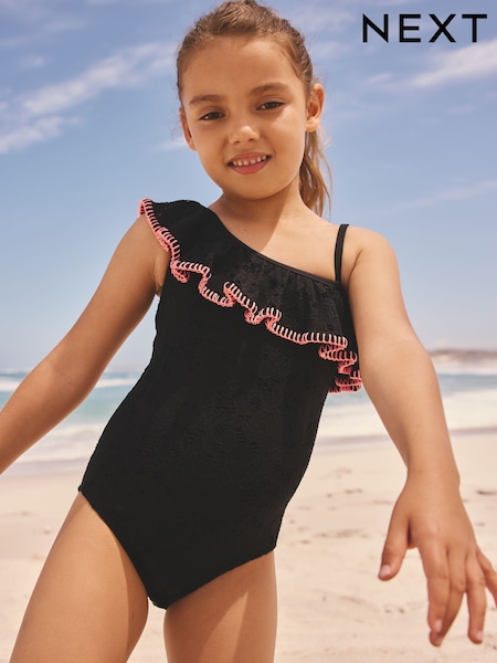 Schwarz Bestickt - One-Shoulder-Badeanzug (3–16 Jahre)