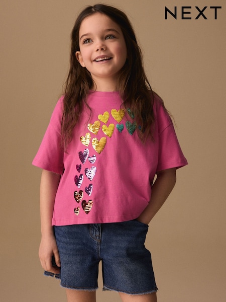 Pink/Regenbogen - Pailletten Herz T-Shirt (3-16J.)