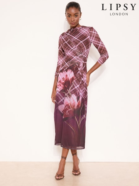 Lipsy Floral Check Mesh Knot Side Midi Dress