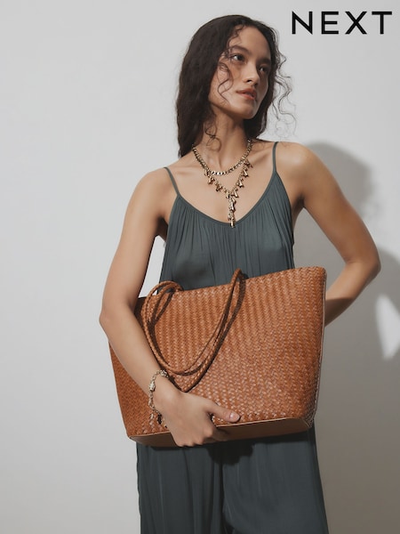 Hellbraun - Schultertasche aus Leder in Flechtoptik