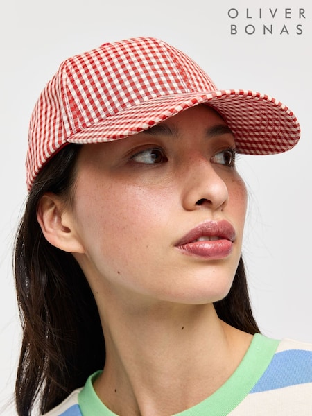 Oliver Bonas Gingham & Embroidered Strawberry Cap Hat