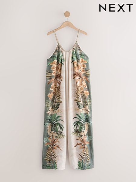 Ecru / Braun Palmenprint - Jumpsuit mit Trägern und weitem Bein