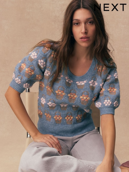 Blau mit floralem Muster - Puff Sleeve Knitted Top