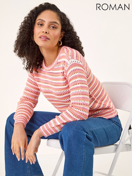 Orange - Roman Streifen Pointelle Rundhals-Strickpullover