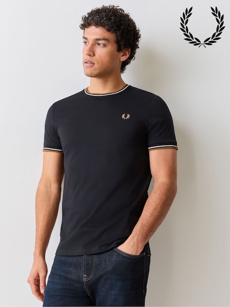 Schwarz - Fred Perry T-Shirt mit doppeltem Streifen und Logo