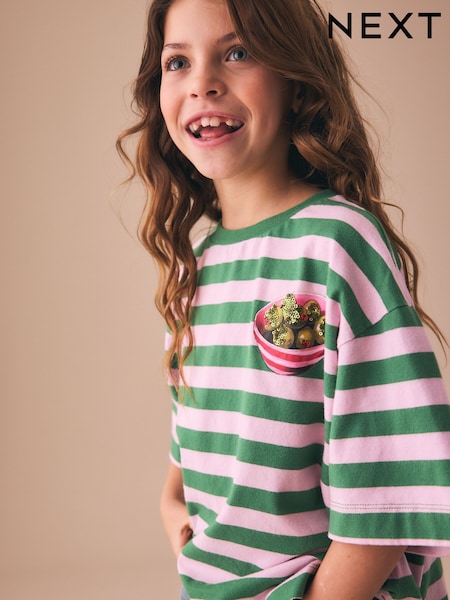 Green Stripe Olive - Oversized Boxy Sequin Graphic T-Shirt (3-16yrs)
