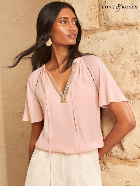 Zartrosa - Love & Roses Sequin Trim V-Neck Short Sleeve Blouse