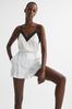 The Payton vest in ivory and black is a versatile option, suited for both daytime and evening events. It’s spun from a luxe silk blend into a colourblock design, with a soft jersey panel added to the reverse. Double shoulder straps feature as an element of refined style. Tuck into high-rise shorts and choose a blazer for a look that will take you through 9-5 and beyond. Silk blend Jersey panel to reverse Colourblock design Deep V-neckline Thin double shoulder straps The model is wearing a size 8 Measurements of model: 5ft11 / 180cm