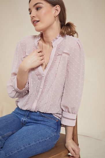 Love & Roses Dobby Lace Trim 3/4 Sleeve Button Through Blouse
