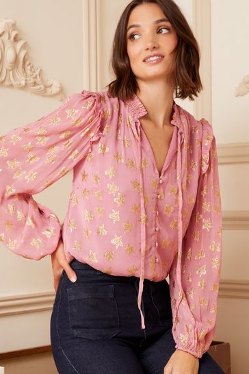 Love & Roses Ruffle Sheer Tie Neck Long Sleeve Blouse