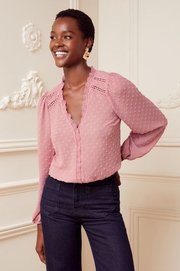 Love & Roses V Neck Lace Long Sleeve Lace Trim Dobby Spot Blouse
