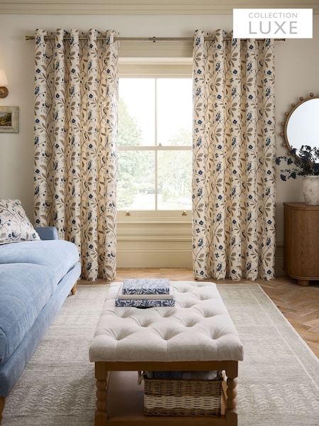 Natural/Blue Collection Luxe Embroidered Birds Eyelet Lined Curtains