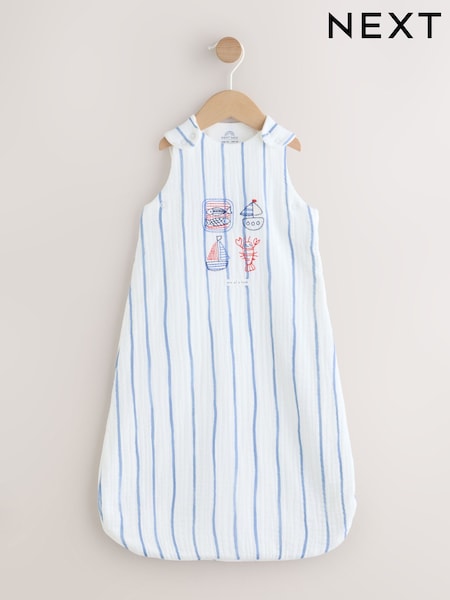 Blue Stripe Embroidered Muslin 1 Tog Sleeveless Baby Sleep Bag