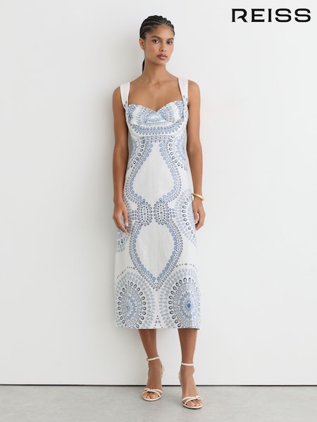 Reiss Ivory Riva Petite Linen Puff-Sleeve Embroidered Midi Dress
