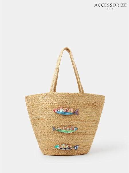 Accessorize Natural Beaded Fish Woven Basket Bag