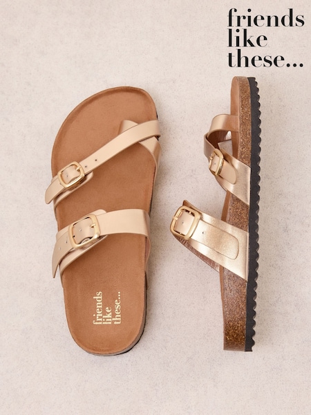 Friends Like These Rose Gold Faux Leather Standard Fit Multi Strap Buckle Detail Casual Footbed Sandals
