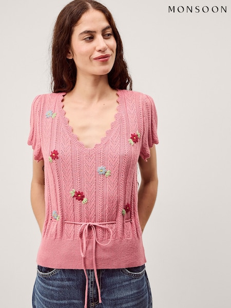 Monsoon Pink Edie Floral Embroidered Short Sleeve Jumper