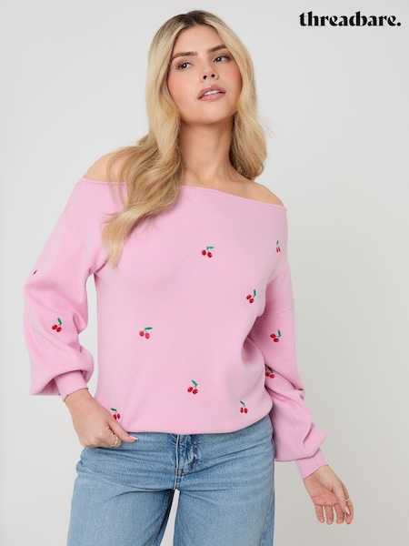 Threadbare Pink Cherry Embroidery Slash Neck Jumper