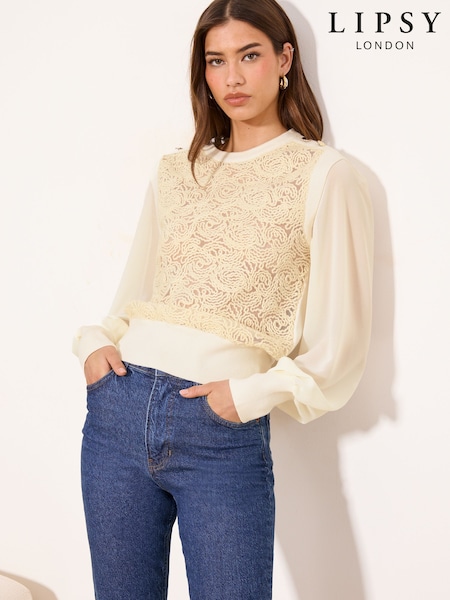 Lipsy Cream Chiffon Sleeve Mesh Pattern Detail Knitted Jumper