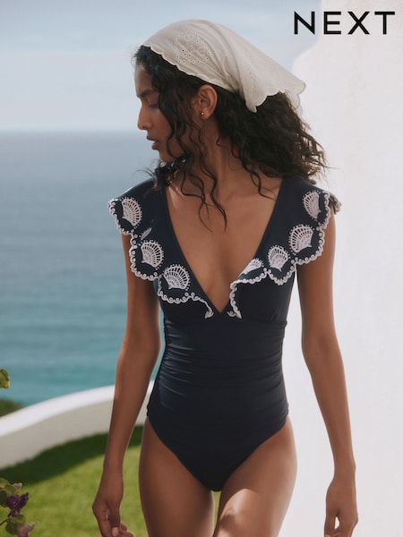Navy/White Embroidered Frill Plunge Tummy Control Swimsuit